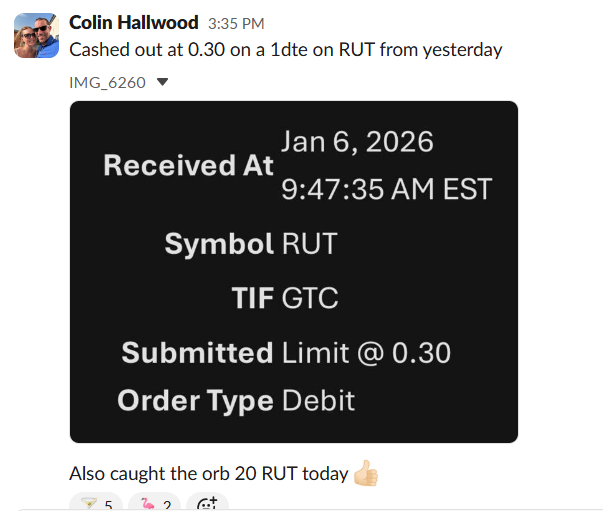 | Colin H. | RUT | Win | 1DTE cashed at 0.30 + ORB20 |