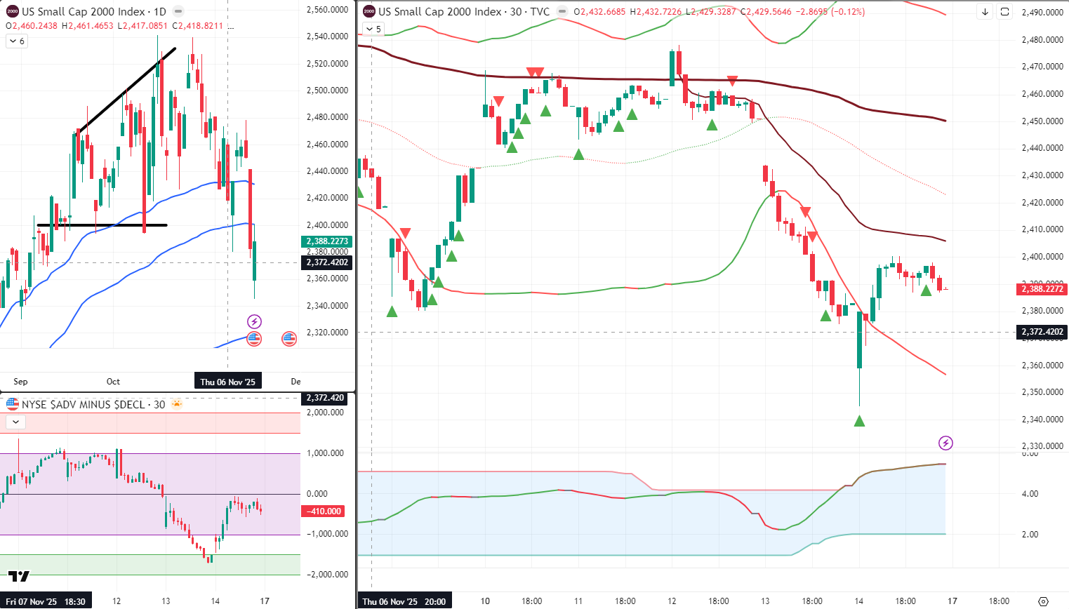 Friday pattern repeating (big sell off, bigger turnaround move) with difference being lack of huge bull reaction and very little premarket futures activity suggesting excitement over for moment, big wick assessment potentially completing (narrow ranging day expected today as extremes tested markets digest), SPX and RUT both bullish on usual entry timeframes (sitting waiting theta decay mode), continuing watch Anchored VWAP from swing low (served well last week for management without PFZ wait).
