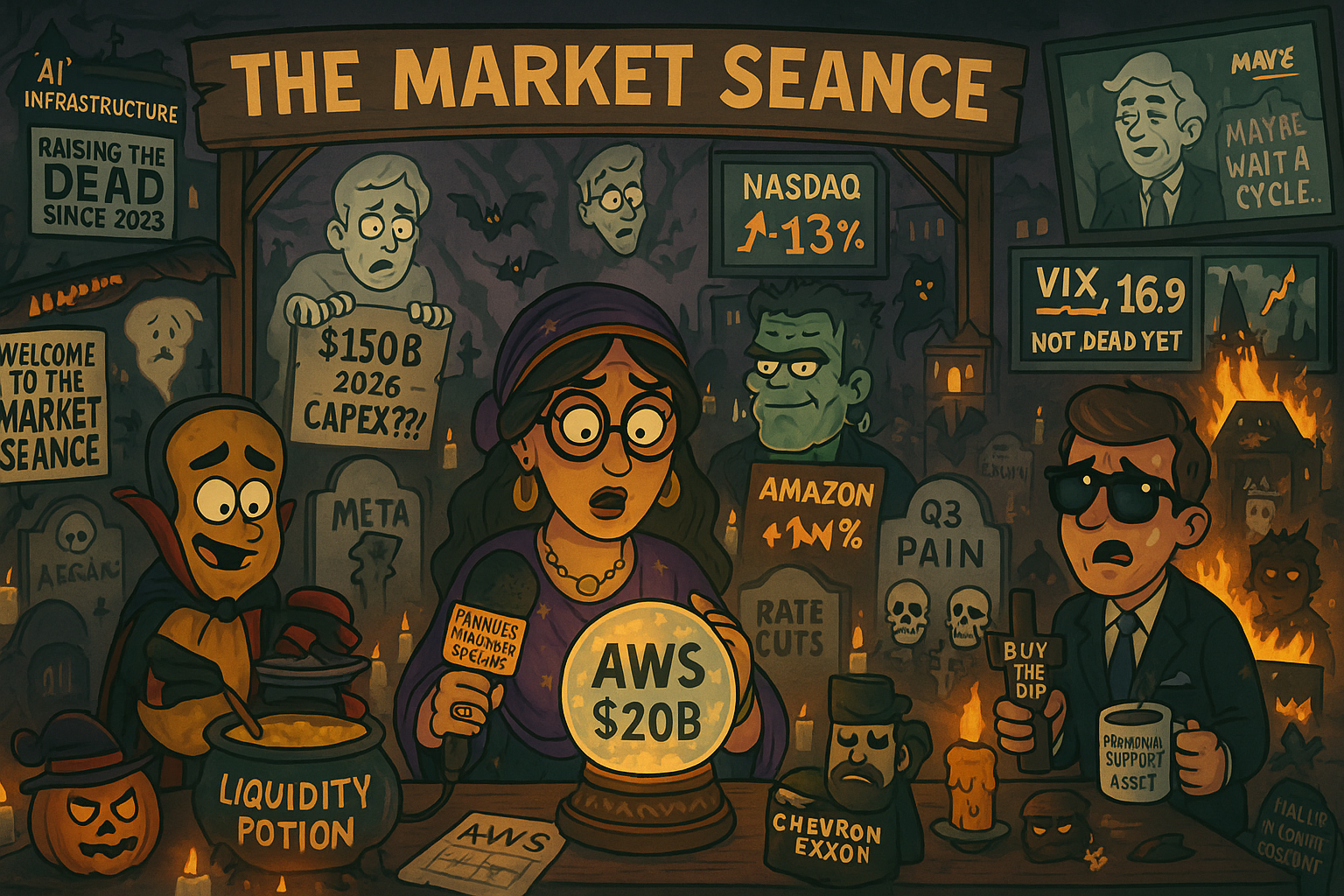 And what a Halloween horror show the markets delivered. Amazon rises from the dead. Apple conjures guidance. Meta’s ghost haunts tech. $16B crypto expiry at witching hour. Powell’s trick: “Maybe wait a cycle.”