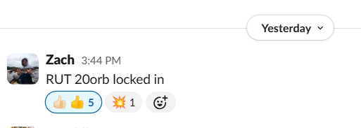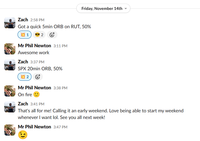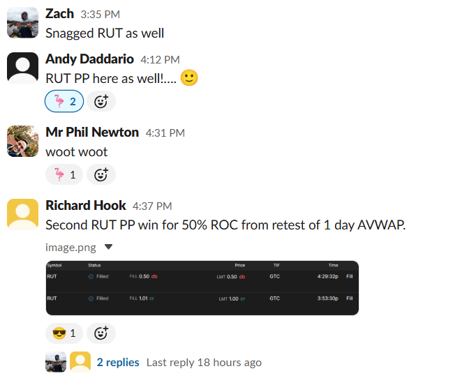 | Andy D. | 50% · 50% · 50% · 50% | “RUT ORB 20 for a nice win!” · “2 for 2 today” |
