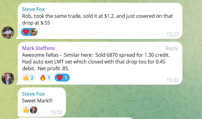 | Mark S. | 65% | “Sold 6870 spread for 1.30 credit… Net profit .85” |