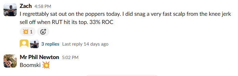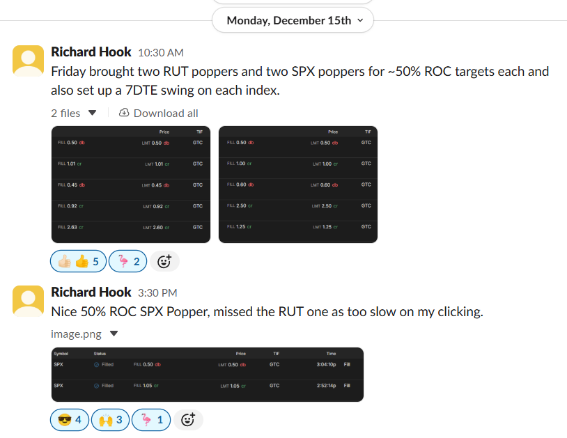 “Friday brought two RUT poppers and two SPX poppers for ~50% ROC targets each”