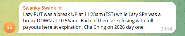 “Lazy RUT was a break UP at 11:28am (EST) while Lazy SPX was a break DOWN at 10:56am. Each of them are closing with full payouts here at expiration.”