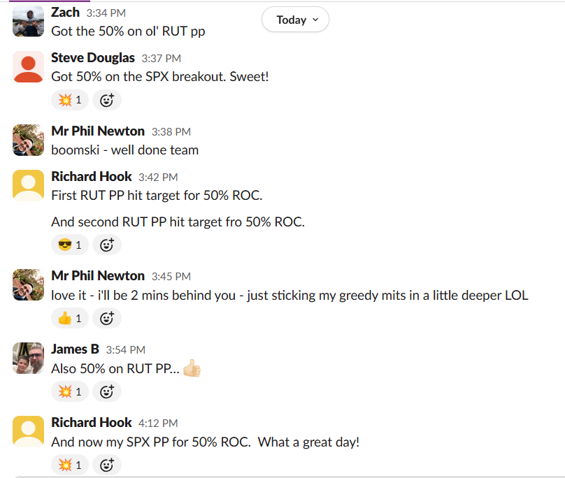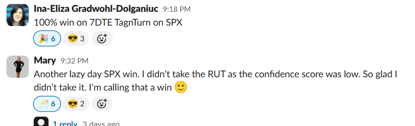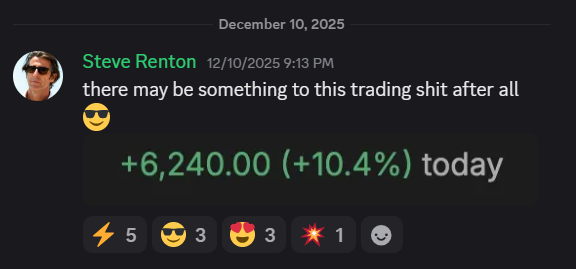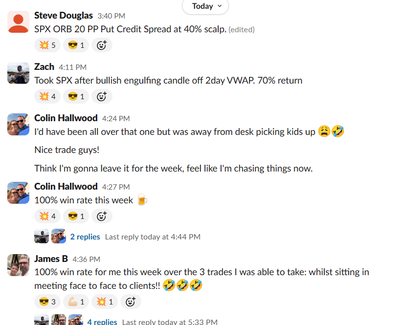 Colin crushed a 100% win rate week with a 97% 1DTE cherry on top. James B. went 3-0 whilst literally sitting in face-to-face meetings with clients. Steve R. banked $16,250 in weekly profit and declared “there may be something to this trading shit after all.”
