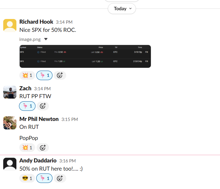 Richard H. 50% · 50% · 50% · 50% · 50% · 50% · 50% · 50% “Nice SPX for 50% ROC” / “Took the RUT VWAP trade. Bit of a grind, but just hit 50% ROC” / “What a great day!” / Openly shared RUT loss alongside wins