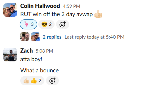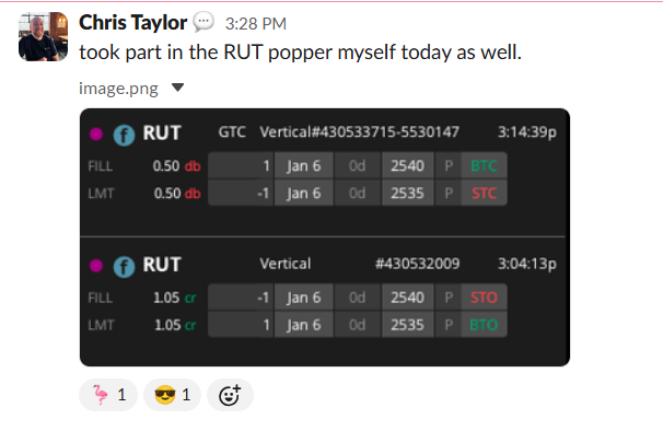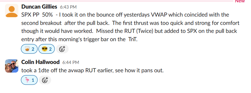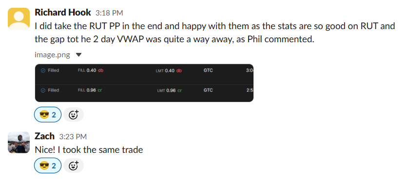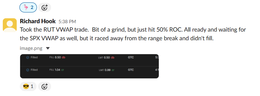 100% win rate for the week. Plus a 97% ROC on Tuesday’s 1DTE RUT. His comment on AVWAP: “Although not a brand new concept, it is for me and been a game changer.”