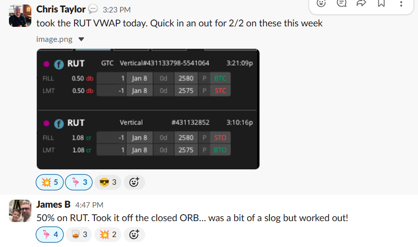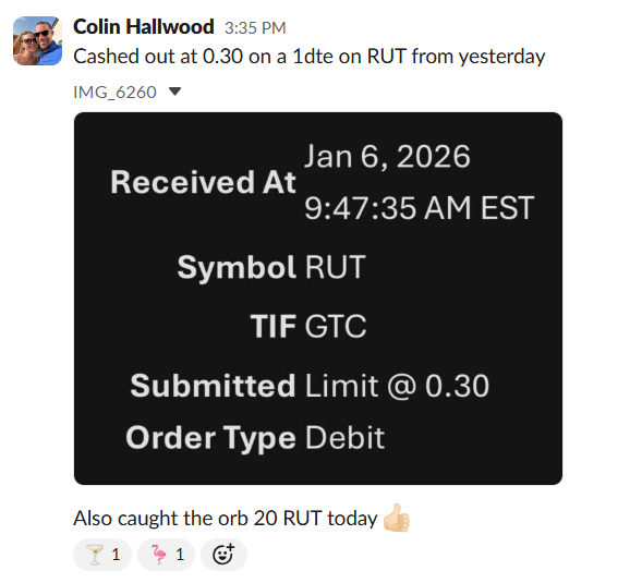 Eight separate 50% wins across the week. Poppers, VWAP, ORB – all delivering. Also showed transparency by openly sharing a RUT loss alongside the wins: “Just an SPX win for me on the second B/O, sadly a RUT loss on the bear break… That’s enough for me today.”