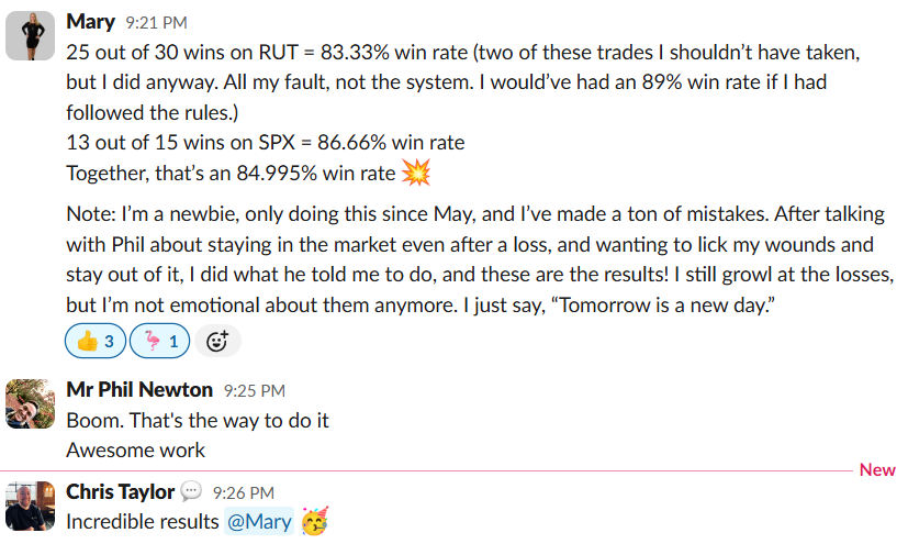 Mary started in May. Made “a ton of mistakes” by her own admission. But instead of developing elaborate theories about why the system was wrong, she did something radical: she listened. “After talking with Phil about staying in the market even after a loss, and wanting to lick my wounds and stay out of it, I did what he told me to do.” Result? 85% win rate.