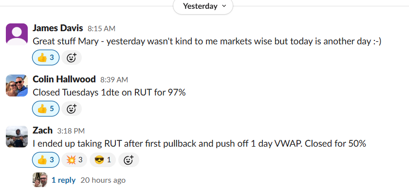 • Mary: Skipped low-confidence RUT setup – “calling that a win”
