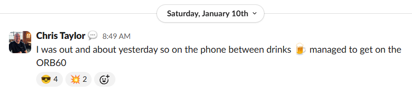 • Chris T.: “on the phone between drinks managed to get on the ORB60”