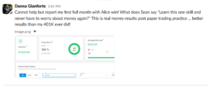Her note: “Cannot help but report my first full month with Alice win! What does Sean say ‘Learn this one skill and never have to worry about money again?’ This is real money results post paper trading practice… better results than my 401K ever did!”