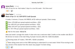 | John M. | 3 wins | Mon 4/20 missed SPX down prem pop, took RUT lazy pop for the W / Fri 4/24 “Caught the RUT prem pop and for once wasn’t too greedy and took profits and thank goodness :)” / Fri 4/24 SPX 7120/7110 P spread win. “Wanted to size up…. for about 30 seconds lol. Went back to normal size and worked out great. Enjoy the weekend :)” |