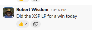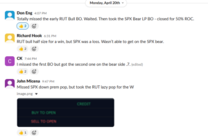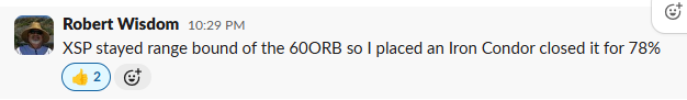 | Robert W. | 2 wins / IC at 78% | Mon 4/20. “Did the XSP LP for a win today” / Wed 4/22 XSP stayed range bound off 60ORB, placed an Iron Condor, closed for 78% |