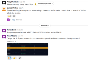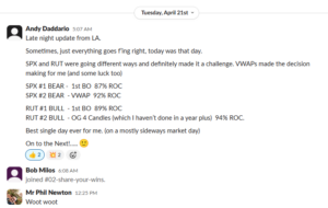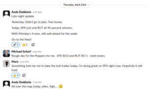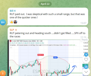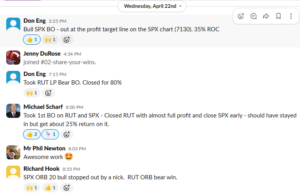 | Richard H. | 2 wins / 1 loss / 1 half-size | Mon 4/20 RUT bull half size for a win, SPX was a loss, wasn’t able to get on SPX bear / Wed 4/22. “SPX ORB 20 bull stopped out by a nick. RUT ORB bear win.” |