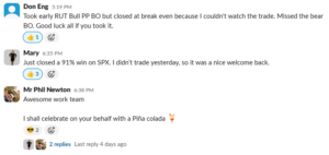 | Mary | Zero losses / +23% on total capital / Best week ever 🏆 | “I had my best week ever! Zero losses and 23% up on my total capital! I’m flying high. It was a rough week but somehow I made it. I’m usually the one losing when you’re all winning. Maybe I’m finally learning, Phil 🙂 Oh, and to be clear, I don’t do premium poppers. I have a smaller account.” / Tue 4/21 91% SPX win. “I didn’t trade yesterday, so it was a nice welcome back.” / Thu 4/23. “Something told me not to take the bull trades today. I’m doing great on SPX right now. Hopefully it will hold.” |