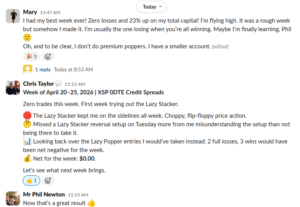 | Chris T. | 0 trades / $0 net / Discipline win 🏆 | First week running the Lazy Stacker. The system kept him on the sidelines through the whipsaw. “Looking back over the Lazy Popper entries I would’ve taken instead: 2 full losses, 3 wins would have been net negative for the week. Net for the week: $0.00. Let’s see what next week brings.” / Phil’s reply: “Now that’s a great result” |