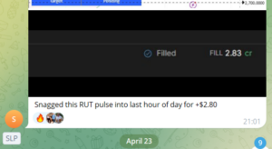 | SLP | 1 win | Thu 4/23. “Snagged this RUT pulse into last hour of day for +$2.80” (Fill 2.83 cr) |